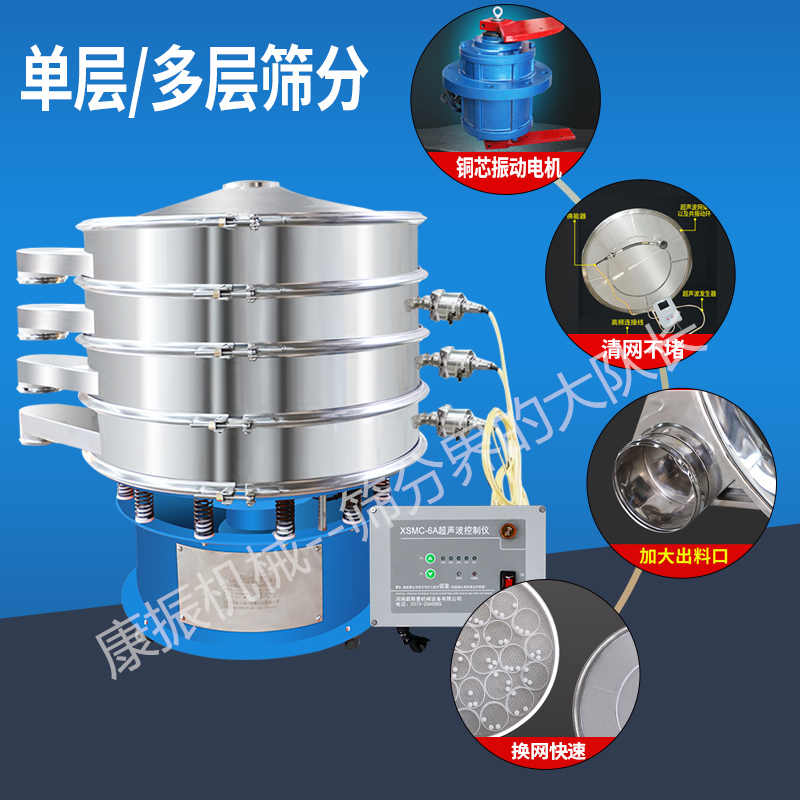 超聲波振動(dòng)篩是將220V、50Hz或110V、60Hz電能轉(zhuǎn)化為36KHz的高頻電能,輸入超聲換能器,將其變成36KHz機(jī)械振動(dòng),產(chǎn)生的功率超聲波使篩網(wǎng)作高頻振動(dòng)。篩網(wǎng)上的物料在作低頻旋振運(yùn)動(dòng)的同時(shí),疊加上超聲振動(dòng),既可防止網(wǎng)孔堵塞,又可使篩分機(jī)提高產(chǎn)量和質(zhì)量,從而達(dá)到快速篩分和清網(wǎng)的目的,使超微細(xì)粉篩分成為易事。該系統(tǒng)在傳統(tǒng)的振動(dòng)篩基礎(chǔ)上在篩網(wǎng)上引入一個(gè)低振幅、高頻率的超聲振動(dòng)波(機(jī)械波),以改變超微細(xì)分體的篩分性能。特別適合高附加值精細(xì)分體的用戶使用。