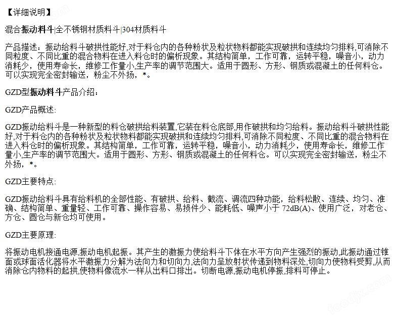 將振動(dòng)由機(jī)接通由源攝動(dòng)由機(jī)起振。且產(chǎn)生的激振力使給料斗下體在水平方向產(chǎn)生強(qiáng)列的振動(dòng)此振動(dòng)通過(guò)錐面或球面活化器將水平激振力分解為法向力和切向力法向力呈放射狀傳遞到物料深處切向力使物料受剪從而消除倉(cāng)內(nèi)物料的起拱使物料像流水一樣從出料口排出。切斷電源振動(dòng)電機(jī)停振排料可停止。