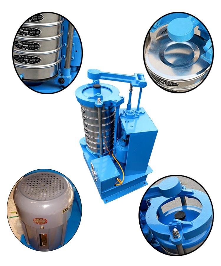 電機(jī)帶動(dòng)齒輪通過(guò)同步帶傳動(dòng)到主軸上,經(jīng)齒輪變速后主軸按要求的轉(zhuǎn)速轉(zhuǎn)動(dòng),主軸帶動(dòng)偏心輪使滑板做往復(fù)運(yùn)動(dòng),帶動(dòng)安裝在滑板托盤(pán)中的試驗(yàn)篩左右搖動(dòng),同時(shí)主軸帶動(dòng)頂桿齒輪轉(zhuǎn)動(dòng),變速后頂桿齒輪通過(guò)凸輪頂擊頂桿,頂桿使拍錘上下拍擊試驗(yàn)篩上蓋,使得試驗(yàn)篩、分樣篩中的物料往復(fù)和上下振動(dòng),使小于試驗(yàn)篩的篩面網(wǎng)孔的物料顆粒篩分進(jìn)下層試驗(yàn)篩,如此層層篩選,使每層試驗(yàn)篩內(nèi)只留相同粒度的物料。達(dá)到不同粒度的分離并確定此物料的粒度組成。