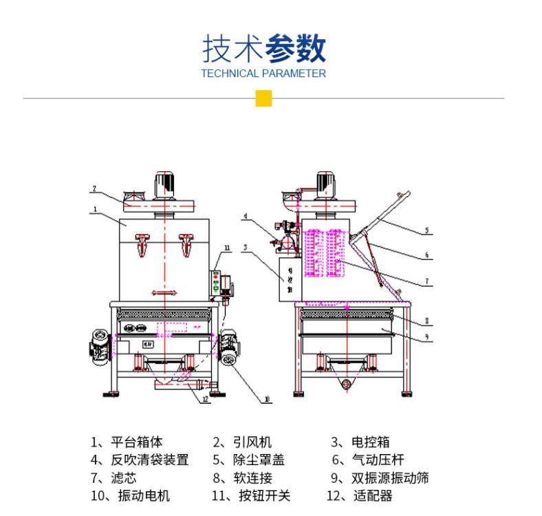 拆包時由于集塵風(fēng)機(jī)的作用,可以避免物料粉塵到處飛揚(yáng)。