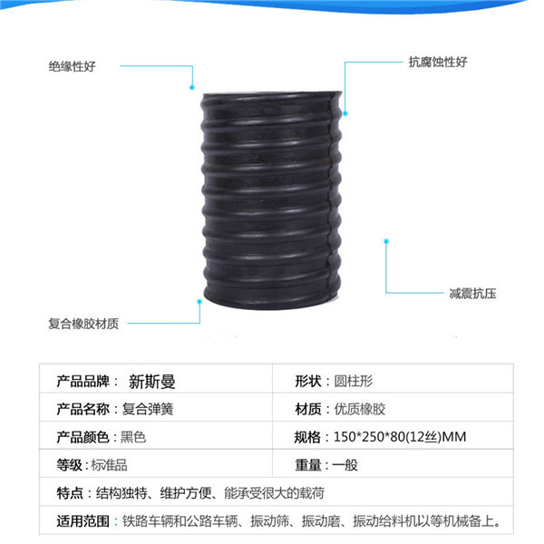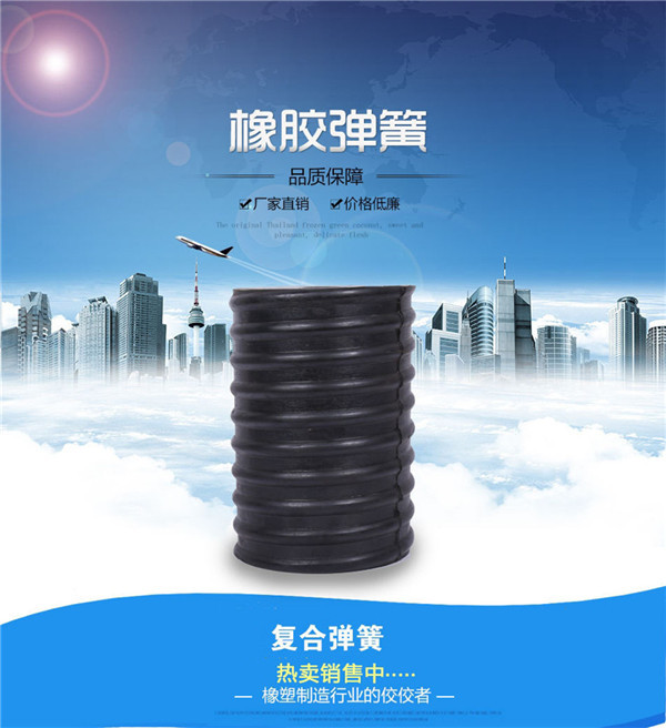 產(chǎn)品詳情product details復(fù)合彈簧:是由金屬螺旋彈簧和橡膠復(fù)合在一起的園筒狀彈性體。該產(chǎn)品優(yōu)于金屬?gòu)椈?,具有抗腐蝕性好、壽命長(zhǎng)等優(yōu)點(diǎn),與其它彈簧相比,減振能力強(qiáng),緩沖效果好。