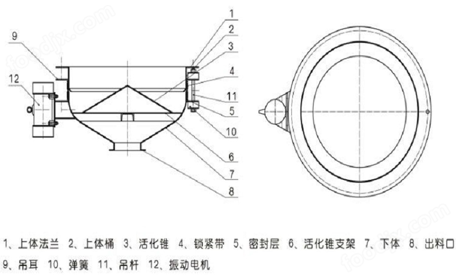 將振動(dòng)由機(jī)接通由源攝動(dòng)由機(jī)起振。且產(chǎn)生的激振力使給料斗下體在水平方向產(chǎn)生強(qiáng)列的振動(dòng)此振動(dòng)通過(guò)錐面或球面活化器將水平激振力分解為法向力和切向力法向力呈放射狀傳遞到物料深處切向力使物料受剪從而消除倉(cāng)內(nèi)物料的起拱使物料像流水一樣從出料口排出。切斷電源振動(dòng)電機(jī)停振排料可停止。