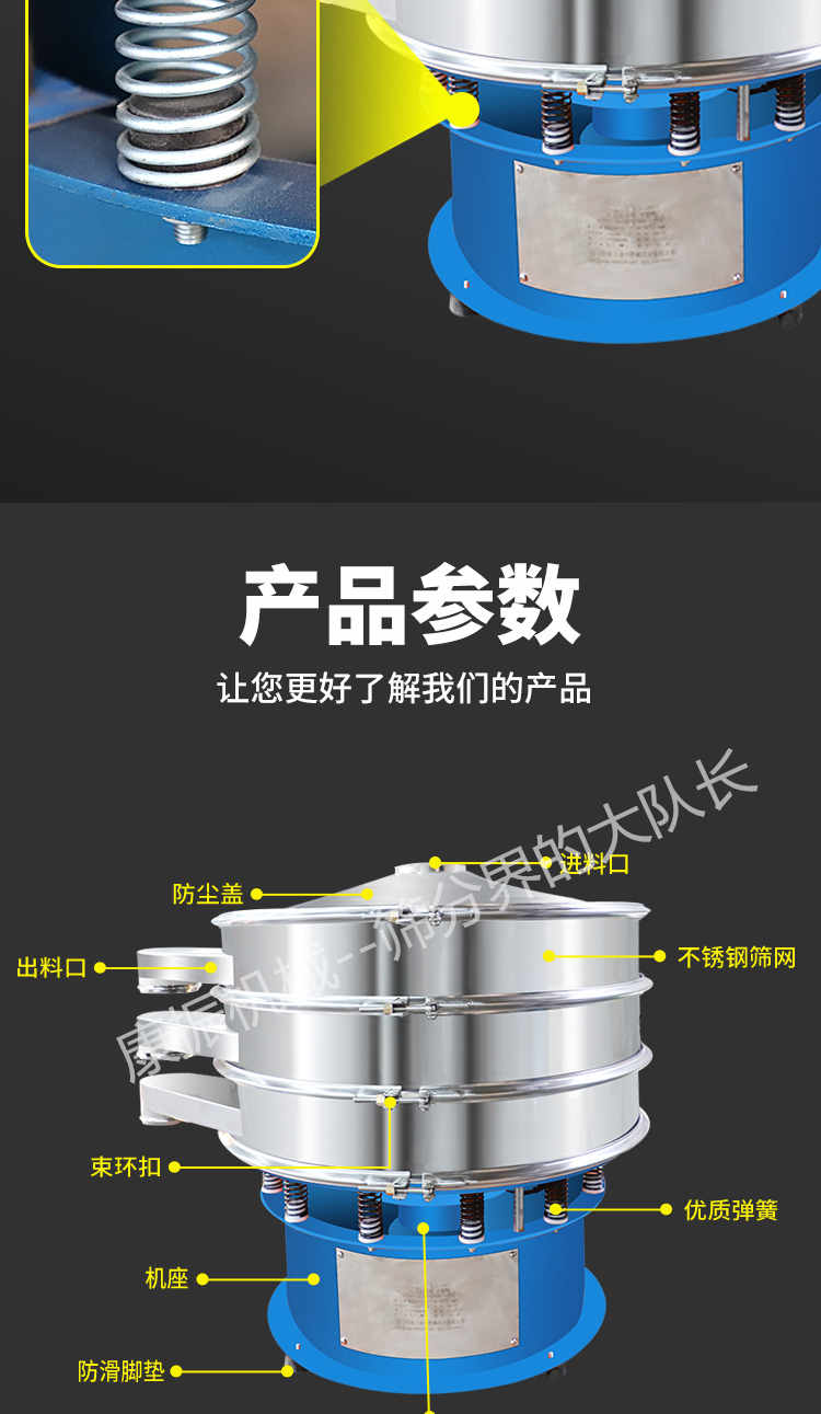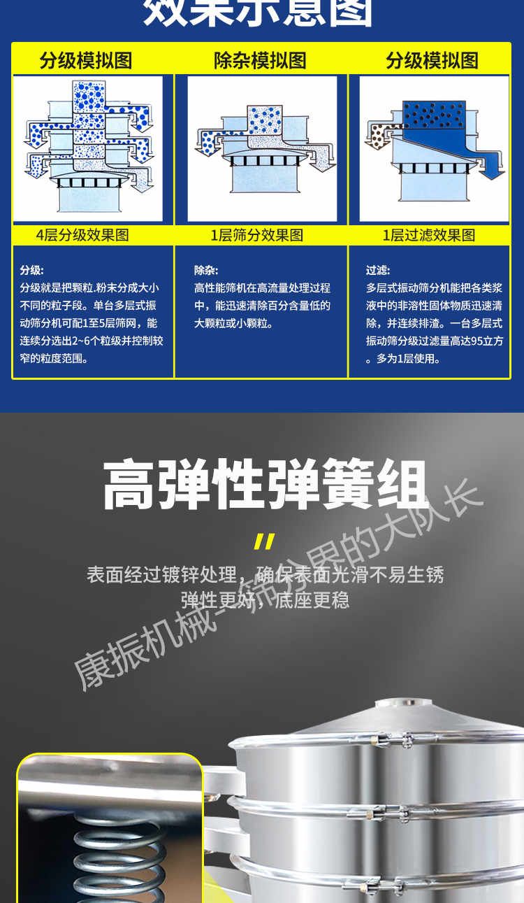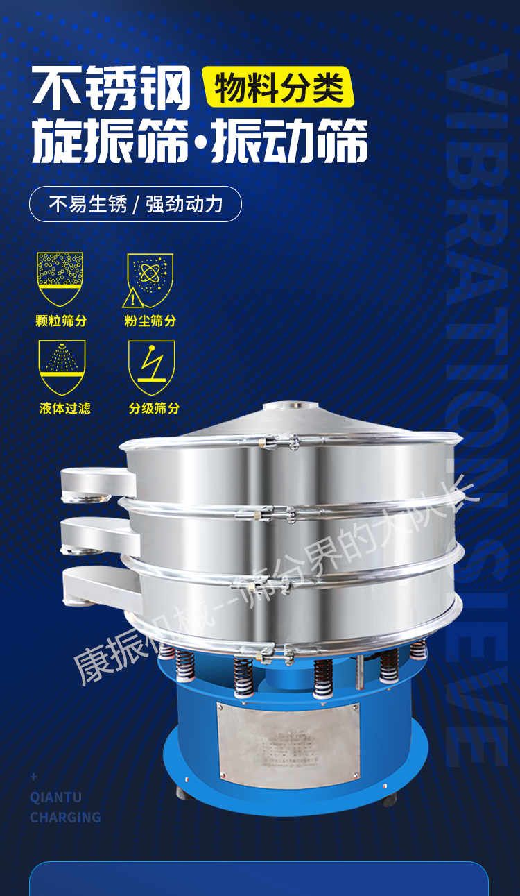 2、去液體:本設(shè)備單層、多層使用,可十分有效地處理固體、液體的混合物料??焖賹?shí)現(xiàn)固液分離,并篩選過(guò)濾出不同的目的物料。