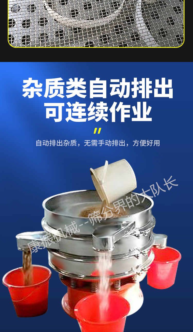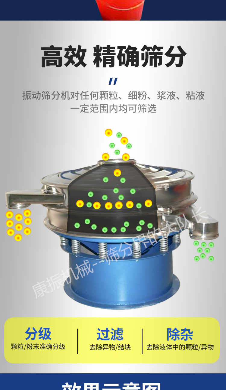 3、去雜質(zhì):本設(shè)備可對(duì)大量物料,除去大小不同的小部分物料,進(jìn)行快速分離。